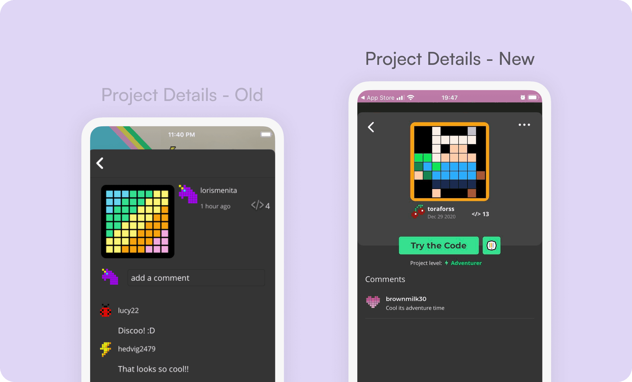 To tackle users' overwhelming feelings when seeing a more complex project/code, we added a Difficulty Indicator. The indicator was a 3-star system (Adventurer, Challenger, Legendary) that is automatically added to each project/code. This way, users have a small clue about a project's difficulty but, at the same time, see their level when they code.