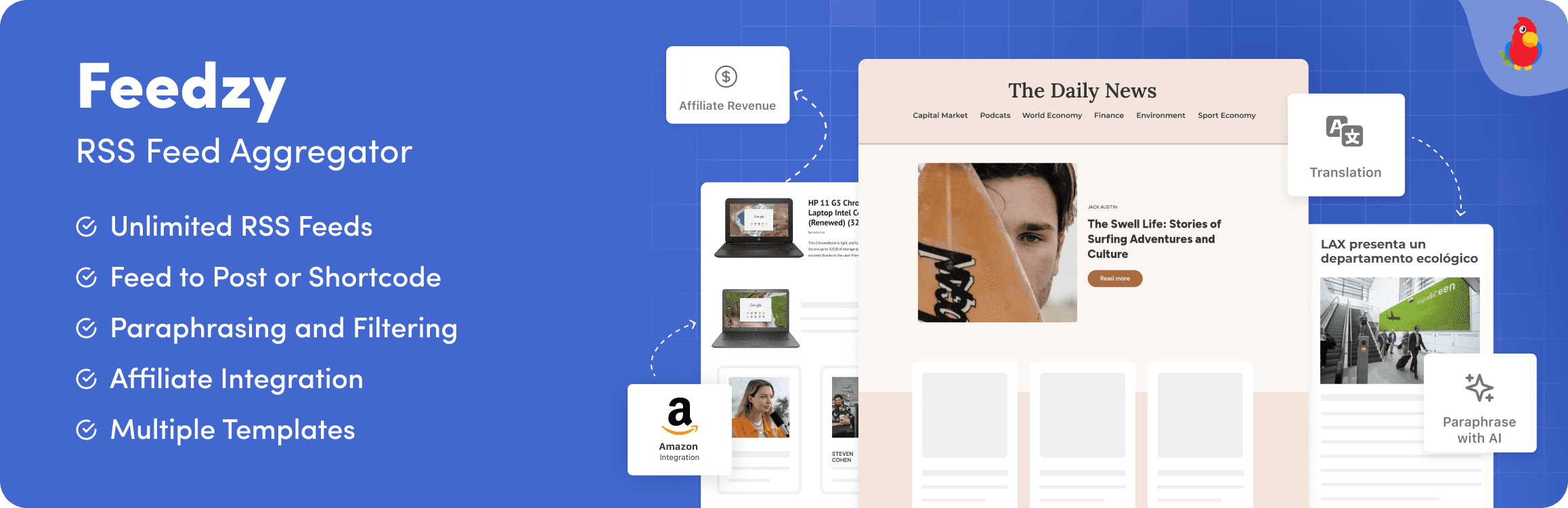 The most powerful WordPress RSS aggregator, helping you curate content, autoblog, import RSS & display unlimited RSS feeds within a few minutes.
